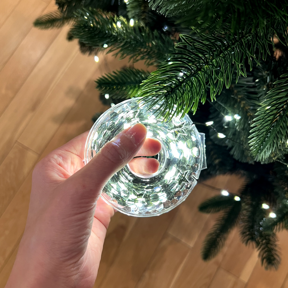 На украшение елки ушло 14 минут, но половину времени заняла перемотка гирлянды. Сложно сразу оценить реальную длину гирлянды и понять, как равномерно распределить ее по всей длине елки. Наличие катушки позволило достаточно быстро и удобно наматывать и сматывать гирлянду, избегая запутывания. Сняли гирлянду за 10 минут.