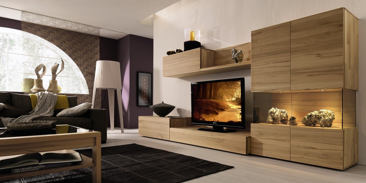 Обычно стены располагаются вдоль стен и состоят из нескольких секций, которые можно располагать в любом порядке. Угловые стены в гостиной выглядят очень красиво и оригинально.