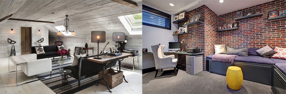 стиль лофт подойдет для кабинета творческого человека, который ценит все необычное и нестандартное. Характерные черты: кирпичная кладка, наличие балок, большие окна, много света, большие кресла под старину, грубые металлические светильники.