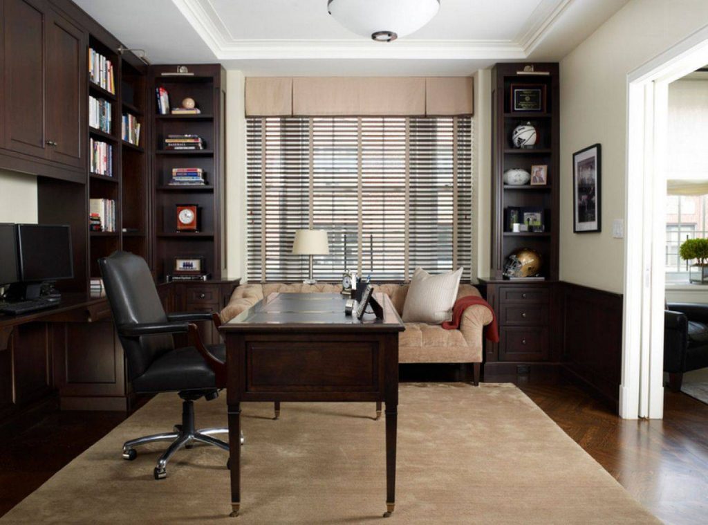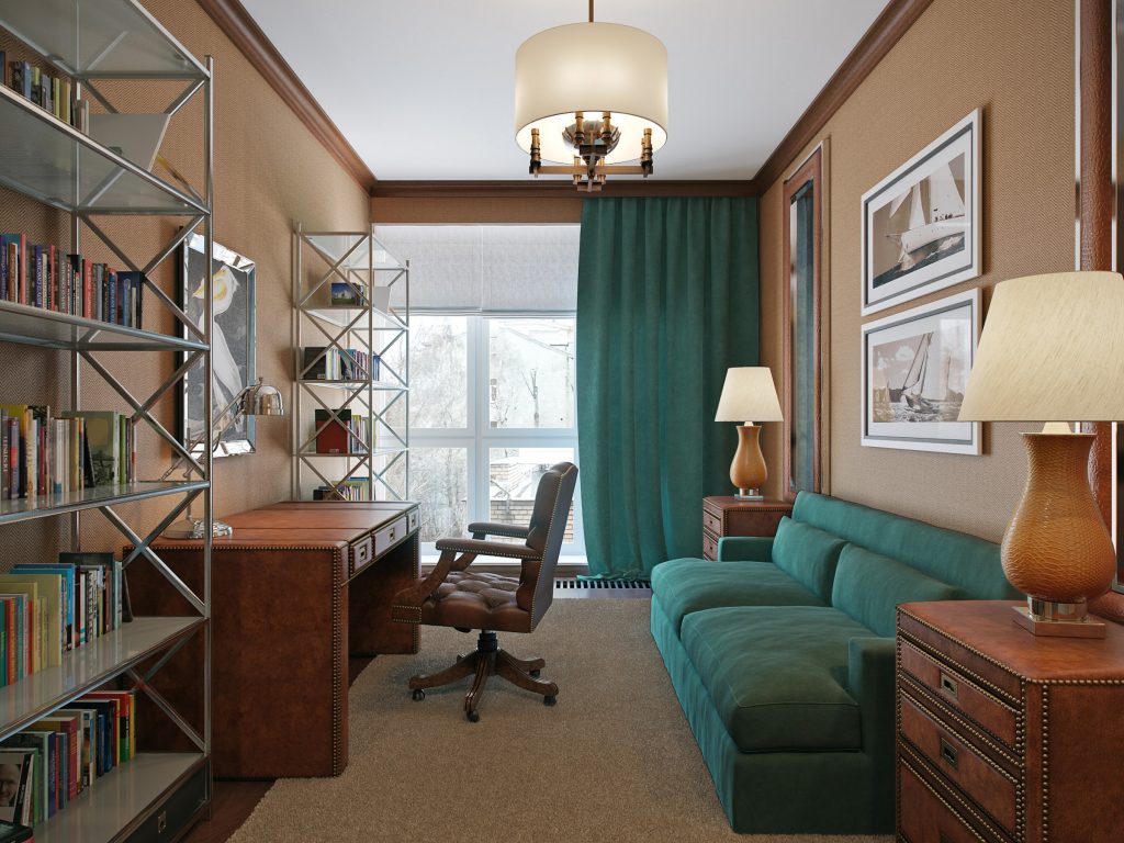 классический стиль с массивной мебелью из натуральных материалов, большой люстрой и элементами лепнины. Цветовая гамма сдержанная, это пастельные, кремовые оттенки, а также насыщенный зеленый и коричневый цвета. Подходит для кабинетов с достаточной площадью;