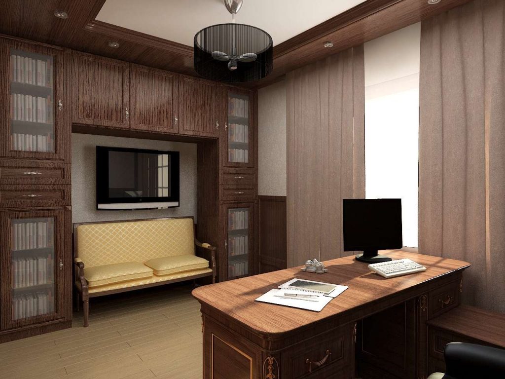 Стол и кресло – главная мебель в кабинете. Отдельно устанавливается шкаф для хранения документации, полки для личных вещей и украшений. Кабинет обставляют строгой мебелью. Требование к столу – многофункциональность и размер (чтобы поместился компьютер или ноутбук, принтер и личные рабочие инструменты, канцелярия).