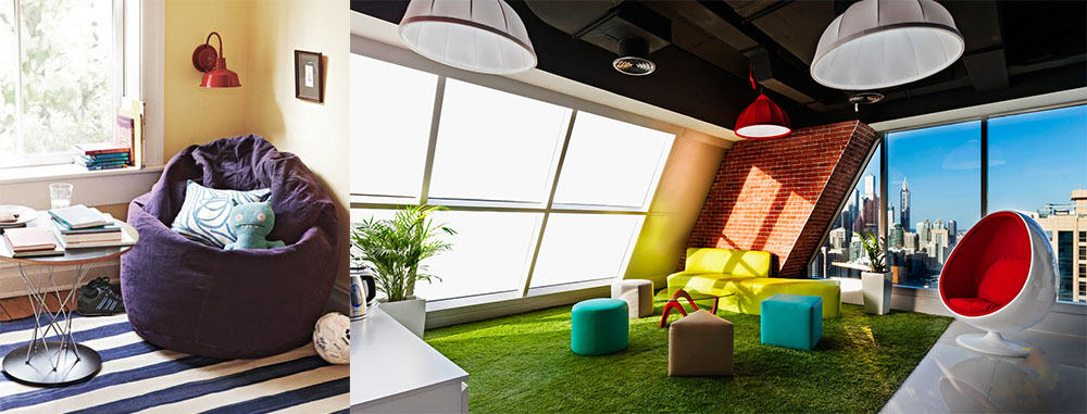 - Удобное расположение — зона отдыха должна иметь визуально заметные границы и находиться в несколько отдаленном от рабочего пространства месте.