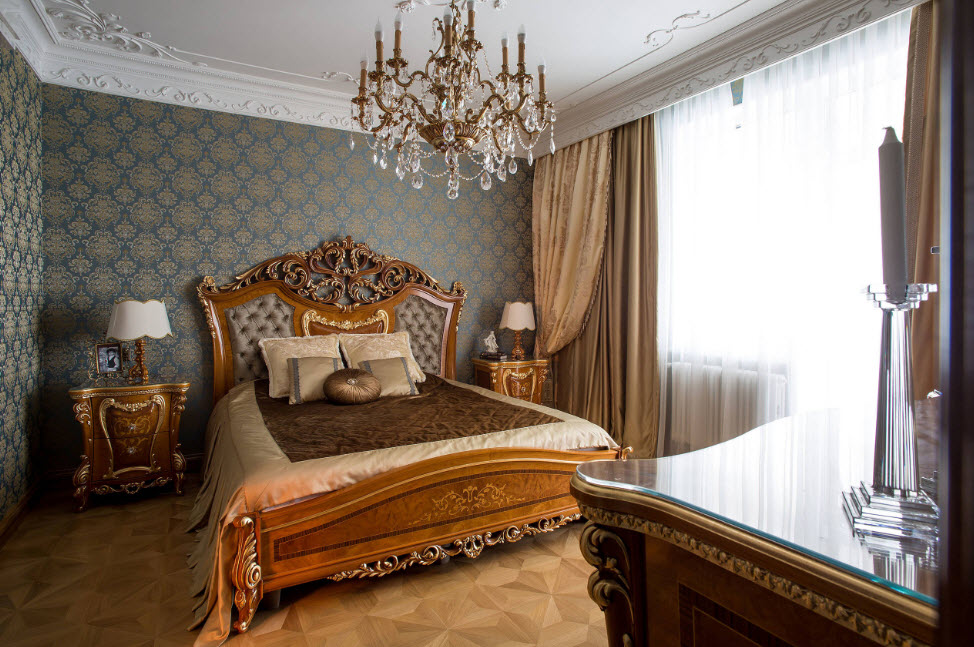 - Для спальни в классическом стиле в качестве декора используется изобилие различных элементов. Самые характерные: текстиль с рюшами или кисточками, статуэтки, фотографии, декоративные подушки, свечи в старинных подсвечниках. Также приветствуется предметы с элементами лепки или резьбы, окрашенные в золотые или серебристые тона.