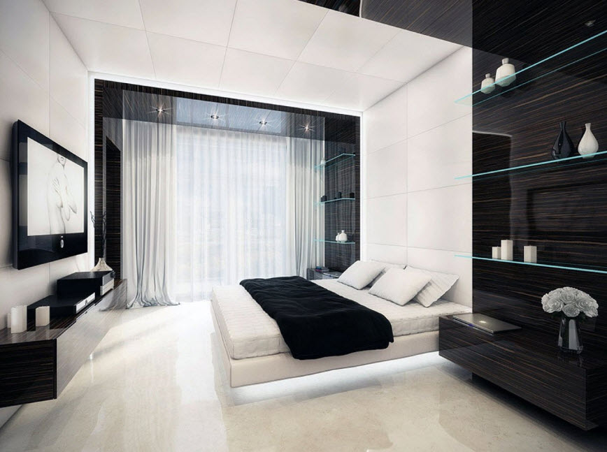 Утонченные очертания, пластичный силуэт – такое ощущение, что почитатели минимализма в спальной комнате постель жесткая, н возлегать там очень комфортно.