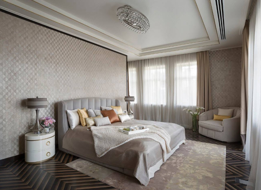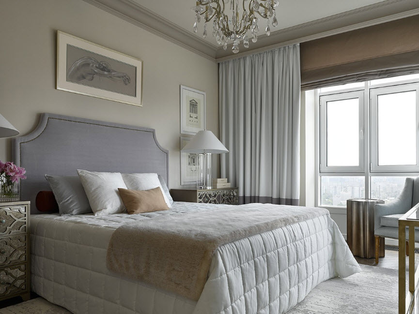 Для большой спальни можно применить как тяжелые портьеры, украшенные пышными складками, так и легкие занавески, придающие комнате воздушность и ощущение простора.
