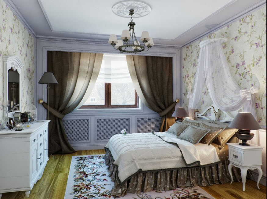 Крой занавесей может быть простым или многослойным с дополнительными элементами (ламбрекены, подвязки с кисточками), главное, он должен соответствовать выбранному стилю спальни.
