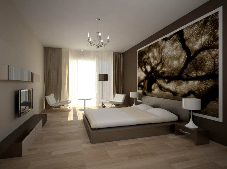 Минимализм – стиль, при котором интерьер спальни выполняется в приглушенных монохромных цветах. Декора, мебели и аксессуаров здесь должно быть минимальное количество. В качестве украшений можно использовать настенные часы, фотографии и фотообои с абстрактными мотивами.