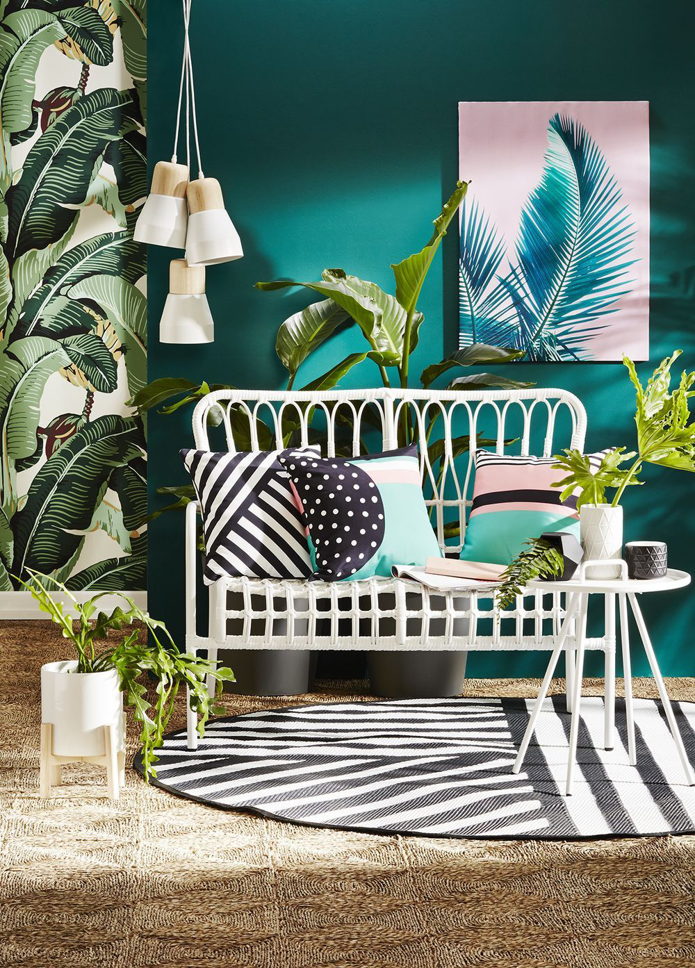 Интерьер гостиной разнообразит окрашенная в белый цвет мебель из ротанга