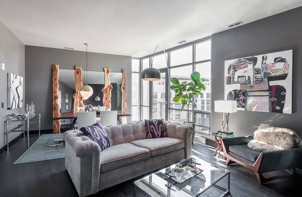 Лавка в темных тонах с деревянными ножками – современная деталь интерьера квартиры-студии