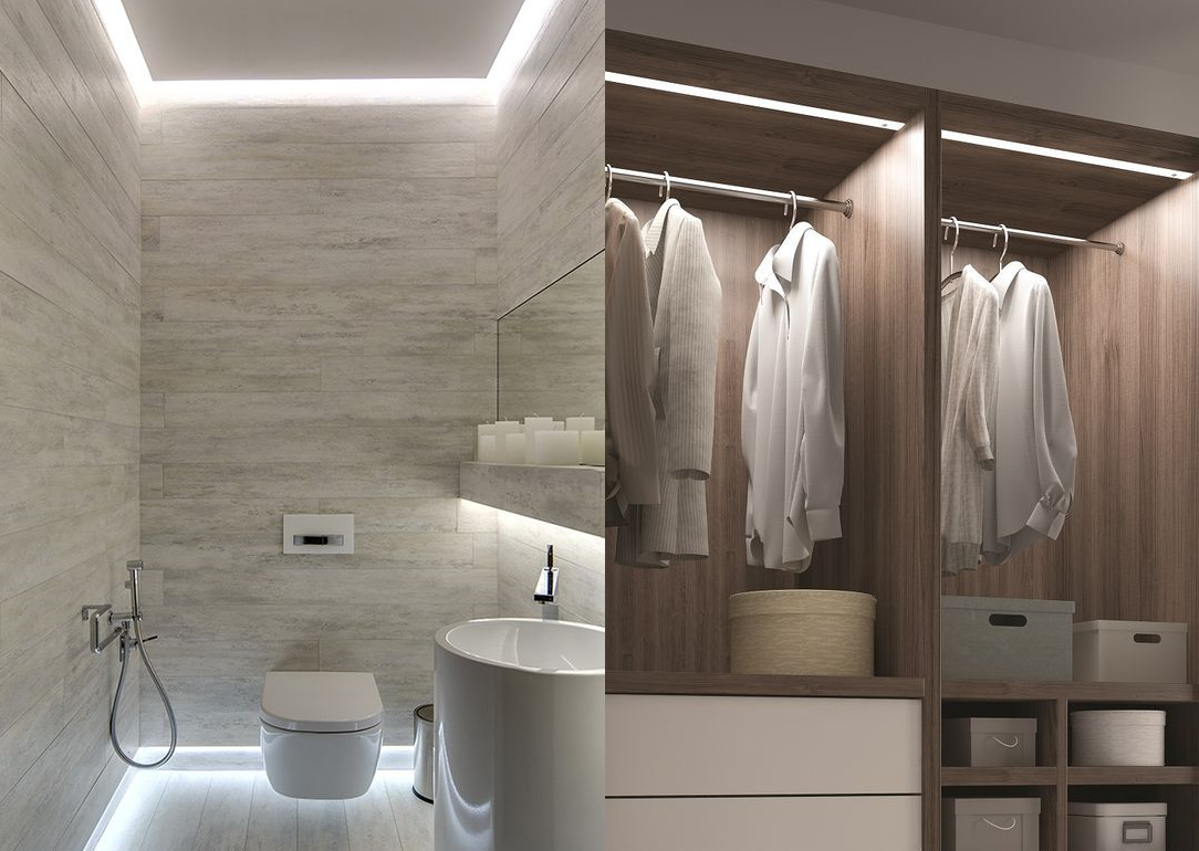 Белый свет ассоциируется с утренним солнцем, считается, что он оказывает стимулирующий эффект на нервную систему, помогает проснуться и сосредоточиться. Такой свет часто можно повстречать в рабочих кабинетах и ванных комнатах. Дотошность белого света делает его хорошим вариантом для гардеробных, прачечных и рабочих зон на кухне. Но и в жилых комнатах многие выбирают белый свет. Какой свет лучше тёплый или холодный — зависит ещё и от стиля интерьера.
