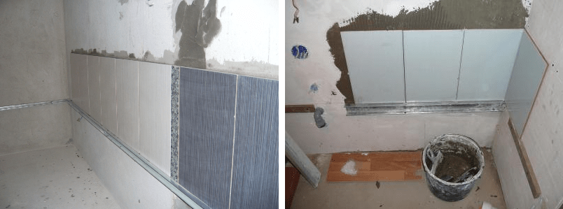 - При помощи строительного уровня проводят горизонтальную линию нижней границы отделки, прикручивают к стене по нарисованной отметке профиль для гипсокартона или ровный брус, на который будет опираться нижний плиточный ряд.