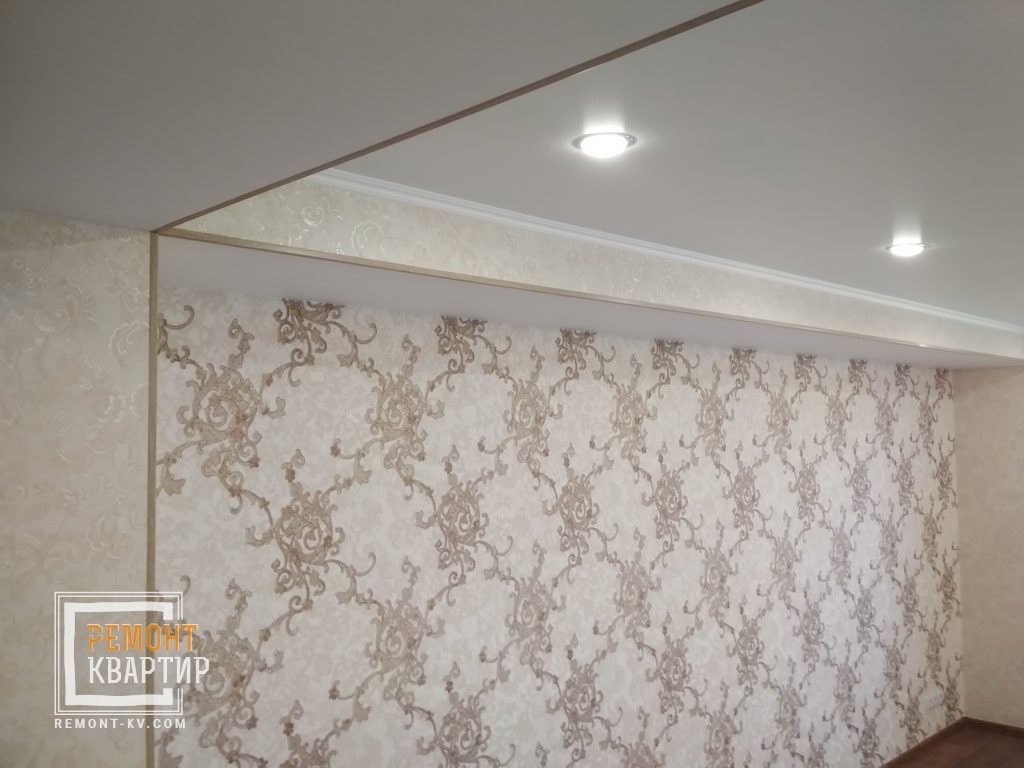 - Чтобы визуально уменьшить зону потолка, можно оклеить его теми же обоями, которые выбрали для комнаты.