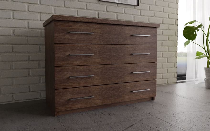 - ДСП и МДФ – главные заменители дерева, причем изделие из ДСП можно назвать вообще бюджетным, вот только этот материал может быть токсичным и выделять опасный формальдегид. При покупке стоит взглянуть на сертификаты безопасности и, конкретнее, на уровень эмиссии формальдегида: для жилых помещений это Е0 и Е1. МДФ – более прочный и безопасный материал. Если дерево не по карману, то лучше брать комод из МДФ. И ДСП, и МДФ сверху ламинируются пленкой с имитацией любого материала, или шпонируются (это предпочтительный вариант). По разнообразию дизайна и внешнего вида таким комодам нет равных;