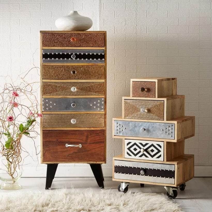 - Металл — такие комоды наиболее устойчивы к ударам, влаге, прочим механическим повреждениям. Но при этом они много весят, а также подвержены коррозии. Последняя проблема решается нанесением слоя краски и предварительной обработкой специальными составами. Единственный минус — травмоопасность, поэтому их не рекомендуется использовать для детей.