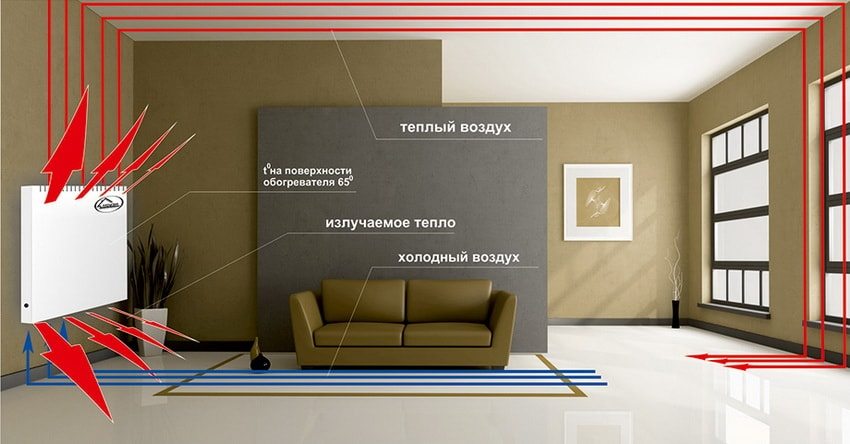 За счёт подобных перемещений происходит обогрев всего воздушного пространства в комнате.