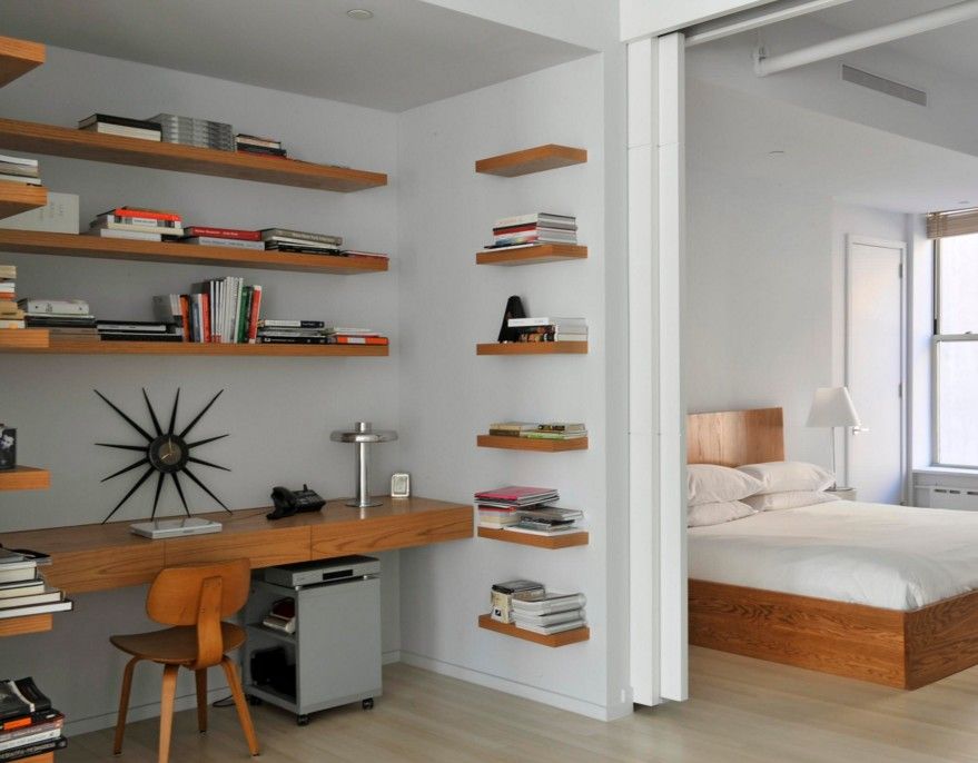 Спальня – помещение в доме, где не должно быть лишних предметов, которые перегружают пространство и мешают расслабляться. Именно поэтому полки в спальне лучше устанавливать обычные, без особых оригинальностей, исключение составляют только самые смелые интерьеры, которые для спален используют не часто.