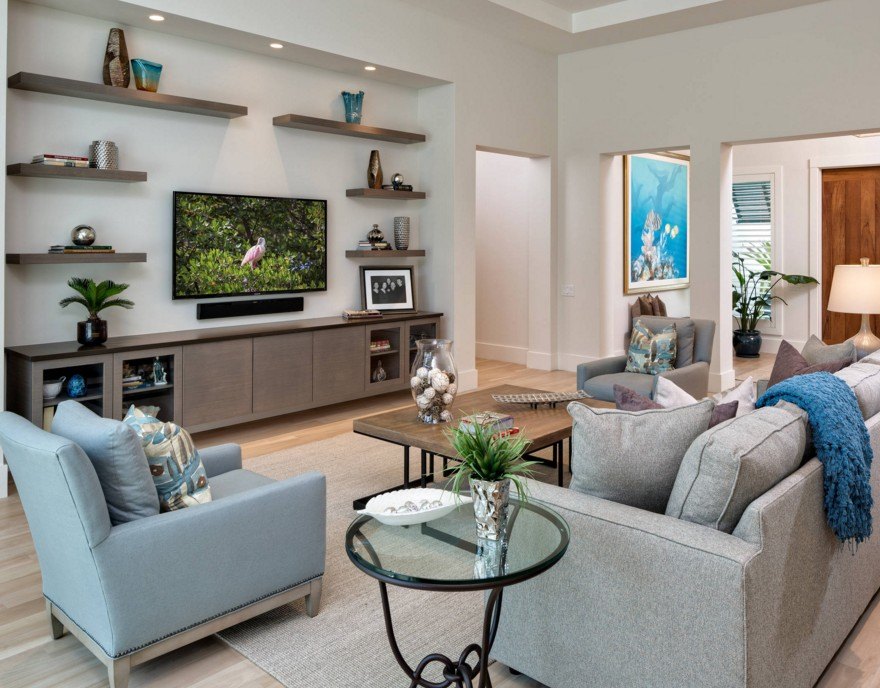 По сути, гостиную комнату можно назвать «лицом» квартиры: сюда приходят гости, здесь собирается вся семья, именно это помещение может рассказать о вкусах, интересах и предпочтениях хозяев, так что к его оформлению нужно подойти со всей ответственностью. Интерьер должен быть одновременно красивым и функциональным. Чаще всего полки располагают над диваном, в нишах или возле телевизора, давайте рассмотрим каждый вариант более подробно.