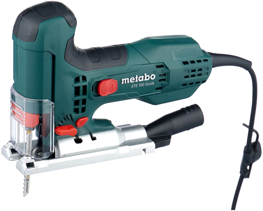 У прибора есть возможность регулировки частоты хода. Имеется быстрозажимное крепление пилки, защитный щиток. Место реза очищается при помощи пылесоса. Глубина пропиливания дерева – 100 мм, алюминия – 20 мм, стали – 8 мм. В комплекте: запасные щетки, ключ, адаптер пылесоса, параллельный упор.