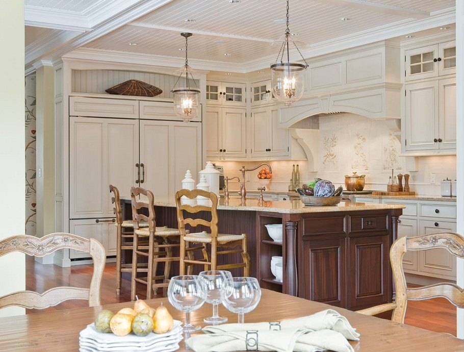 - Можно ли на кухне делать натяжной потолок, если ее стиль кантри или прованс? Вполне, поскольку такая концепция рассматривает потолок, как элемент, не подчиняющийся общим правилам симметрии. То есть это может быть ровное полотно с декоративной розеткой – имитацией конечно, над столовой группой или комбинация полотна и гипсокартонных коробов в виде деревянных балок.