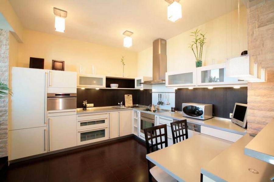 - Если кухня неправильной формы площадью 9 м., хорошим решением является комбинация потолочных ниш квадратной или прямоугольной формы, которая зрительно «исправляет» пропорции, разделяя потолок на зоны. То же самое можно сделать с помощью криволинейных фигур, хотя это сложнее.
