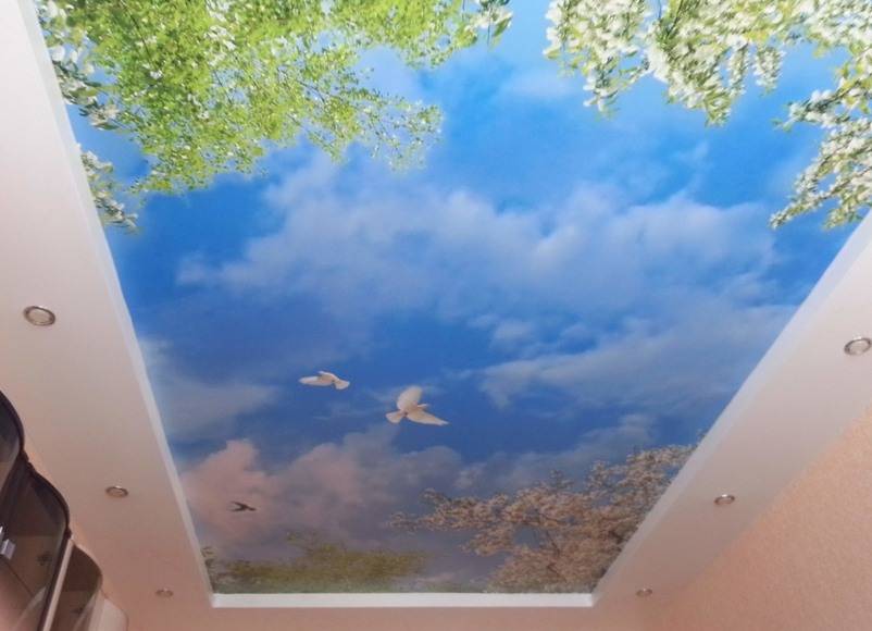 Популярные «звездные» потолки в кухнях, как правило, неуместны – здесь больше подойдут фруктовые мотивы. Изображение голубого неба с легкими облаками или пролетающими птицами позволяет как бы «убрать» потолок вовсе, что сразу же меняет не только зрительную высоту потолка, но и все восприятие интерьера.