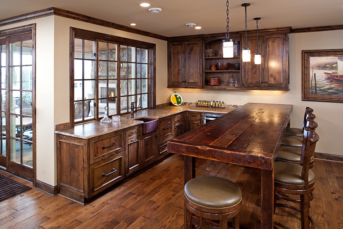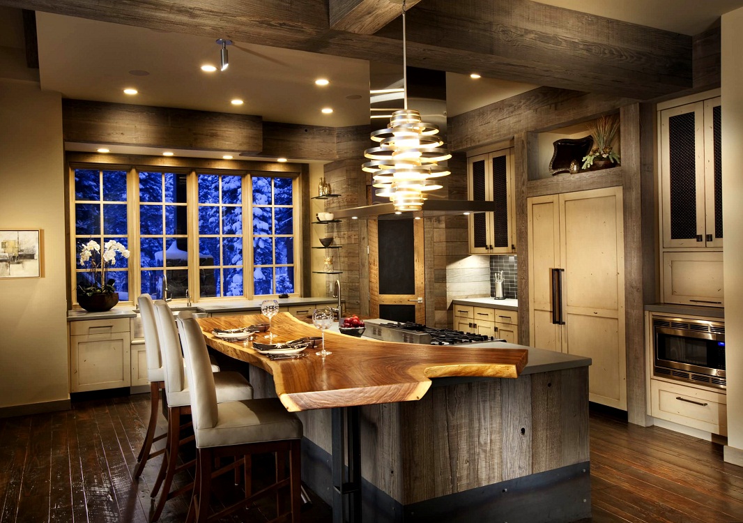В интерьере просторных кухонь, или кухонь, совмещенных с гостиной или столовой уместны массивные деревянные столы.