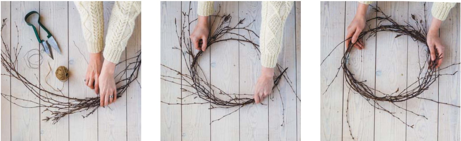 - Возможно, вам понадобится связать веточки еще в нескольких местах, чтобы сделать венок более прочным и придать ему форму идеального круга.