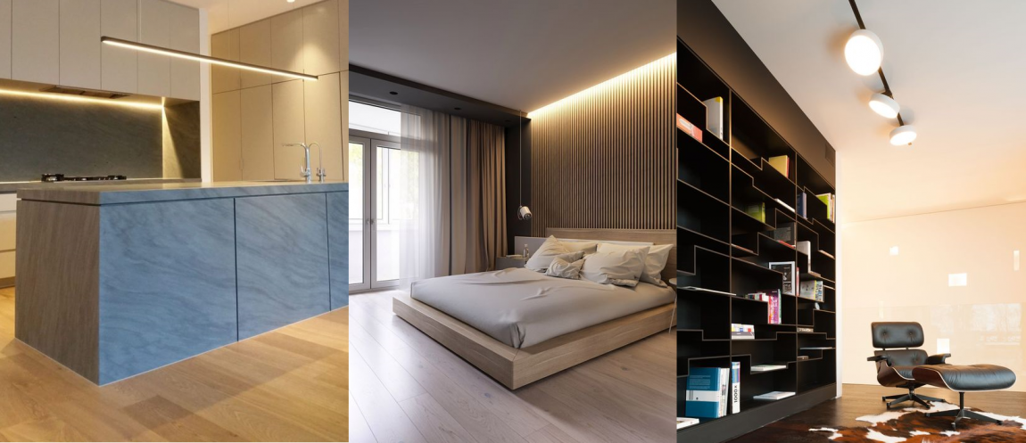 Наиболее важные элементы интерьера квартиры, картины, вазы, настенную графику лучше подсвечивать линейными и точечными светильниками с люминесцентными и галогенными лампами. В отличие от светодиодов они имеют более широкий и насыщенный спектр излучения, поэтому галогенки и экономки используют для декоративной подсветки, а также в тех местах, где требуется полноценная замена дневному свету. Например, в настольных лампах.