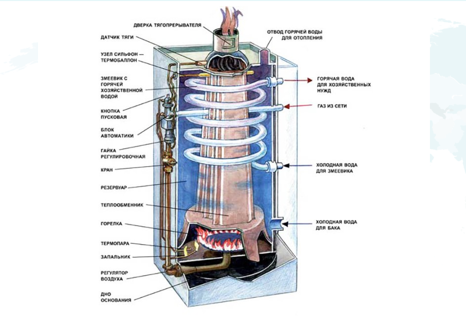 Теплообразующие элементы агрегата: приборы и датчики автоматики, камера сгорания, рубашка (теплообменник), воздуховод (дымоходный канал). В РФ основными поставщиками этого автономного нагревательного оборудования являются Боринский и Жуковский заводы – все аогв жуковский и Боринский выпускаются в напольном исполнении. Боринский завод занимается производством нагревателей напольного типа в прямоугольном корпусе, с автоматикой, расположенной в этом же корпусе сзади. Вся автоматика монтируется в разных исполнениях и комплектациях – это может быть отечественная механическая и/или электронная аппаратура, а также автоматика европейского или американского производства.