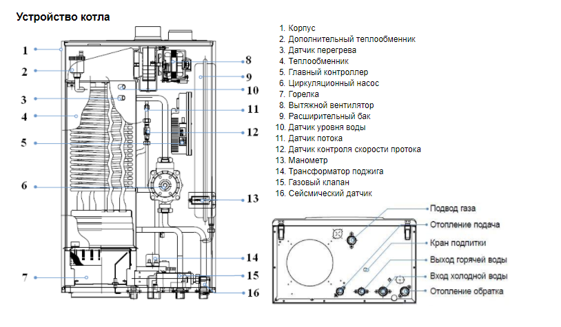 - теплообменник. Устройство теплообмена сконструировано таким способом, что делает возможным разогретым газам несколько раз курсировать через него максимизируя внутренний теплосъем;