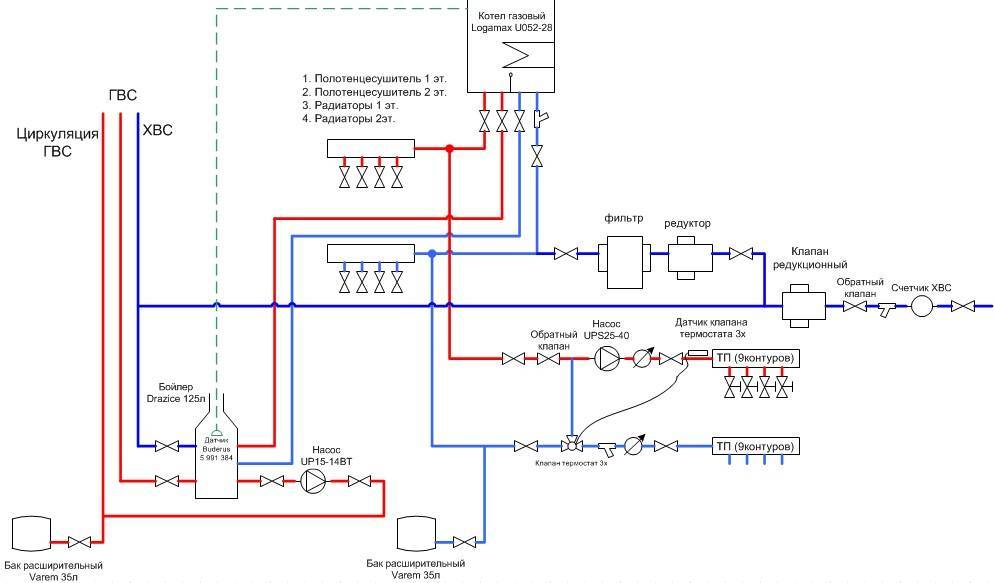 - гидравлическая система, включающая насос для принудительной циркуляции, автоматический клапан для удаления воздуха, теплообменник для нагрева теплоносителя, вторичный теплообменник для системы ГВС;