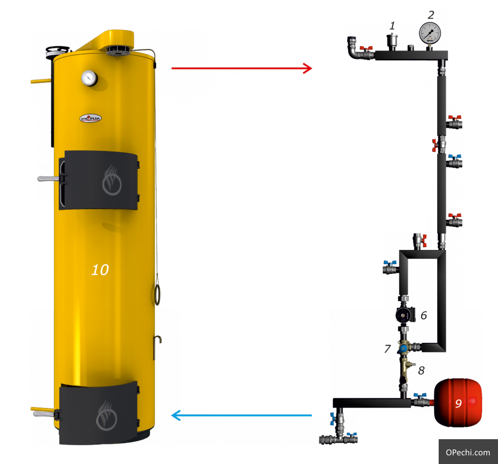 Обвязка котла ничем не отличается от остальных твердотопливных агрегатов