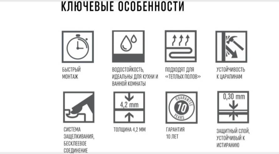 Поверхность полотна также обладает антистатическим эффектом — качественным уходом считается обычная влажная уборка. Скрипа от такого пола вы не услышите, поскольку покрытие не будет ни коробиться, ни рассыхаться. Монтаж такого материала не вызывает затруднений — замковая система позволяет проводить работы по укладке даже непрофессионалам. Весь процесс не требует финишных операций, чем выгодно отличает ламинат от паркета, который нуждается еще в шлифовке и лакировании.