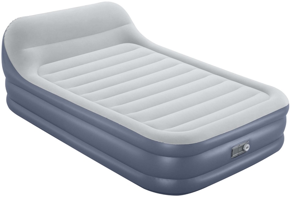 Bestway Tritech Queen SleekFlow 67923 – недорогая бюджетная надувная двуспальная кровать, имеющая оптимальные габаритные размеры 226х152х84 см, рассчитанная на нагрузку до 300 кг. Оформлена в современном стиле, обладает отличной эргономикой. Сделана из прочного трёхслойного материала, который способен длительное время сохранять свои декоративные свойства, имеет приятное на ощупь покрытие, устойчивое к износу. На поверхность материала нанесено антибактериальное покрытие. Для усиления конструкции используются специальные рёбра жёсткости. По периметру кровати выполнен бортик, который предотвращает скатывание с кровати во время сна. Конструкцией предусмотрено изголовье, существенно улучшающее уровень комфорта при расположении двух взрослых людей. Его высота составляет 46 см.