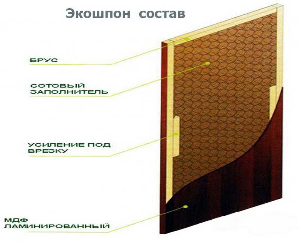 - Каркас – у натуральных он более прочный, состоящий из массива хвойных пород. Такая дверь тяжелее, прочнее, надежнее. У экошпона все делается по эконом варианту, а значит в самых дешевых изделиях допускается сотовое наполнение пустот и недорогой ДСП;