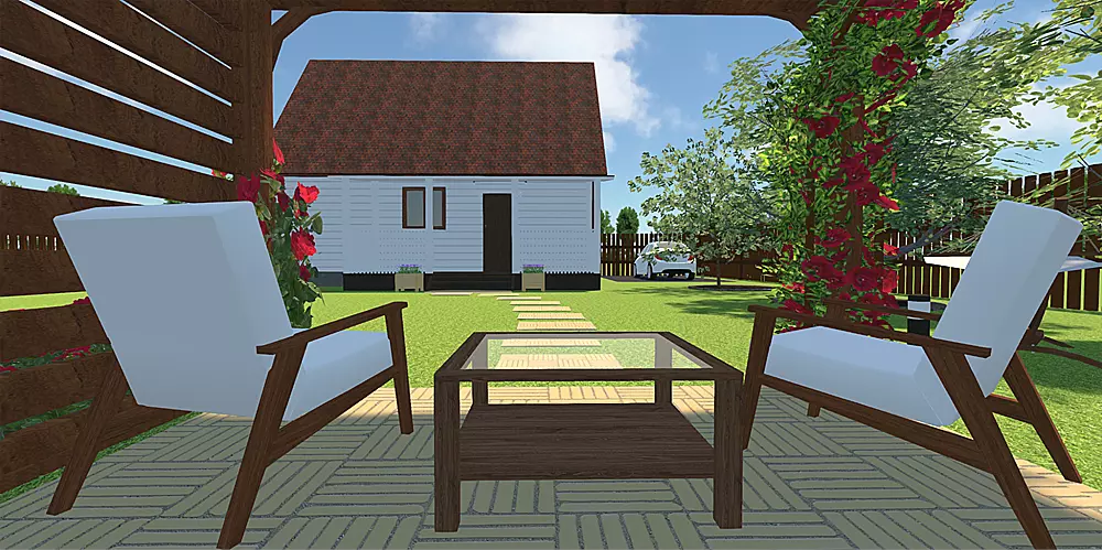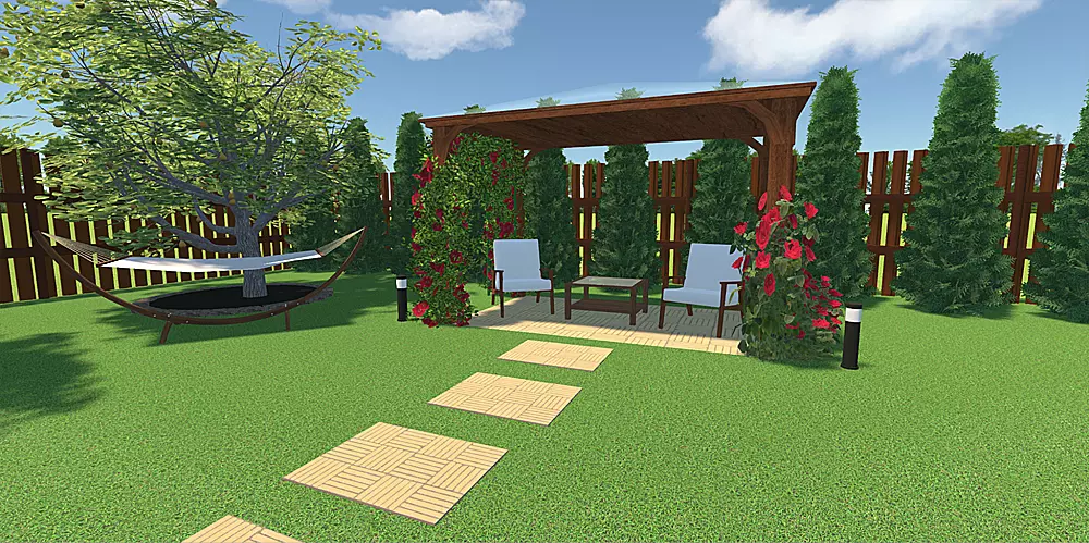 Зону отдыха с навесом для растений решили обустроить на заднем дворе, за домом. Предварительно поставили ограждение (для этого проекта выбрали забор из дерева). Вдоль задней границы участка посадили высокие туи, а слева яблоню. В тени под деревом поставили гамак. Величину растений, как и других элементов, можно регулировать.