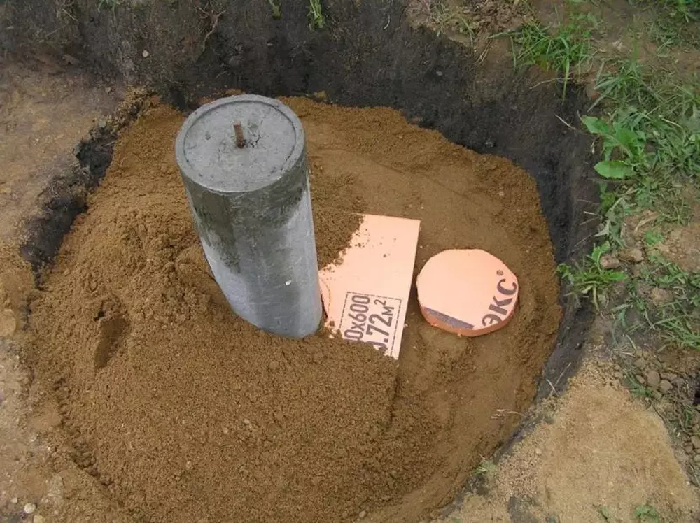 Шаг 2. Подготовка фундамента. В местах установки опорных столбов проделайте в грунте углубления диаметром 25–30 см (исходя из выбранного сечения опор) и глубиной не менее 70 см. На дно насыпьте ровный слой гравия, установите опалубку из асбестовых труб или рубероида. Проверьте уровнем высоту. В опалубку залейте бетонный раствор, вставьте арматуру для придания прочности и крепления опор. Оставьте на 3–4 дня для застывания.
