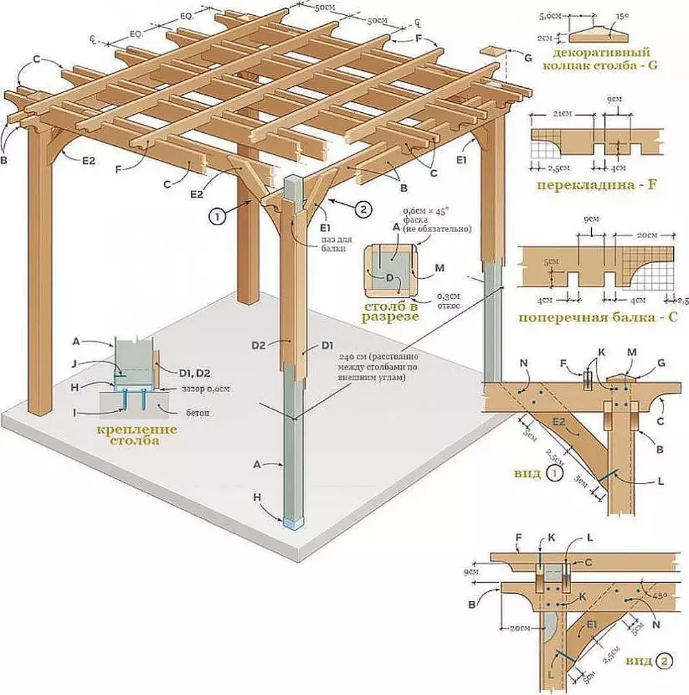 Проект перголы сам по себе не сложен, ведь их разнообразие не накладывает отпечатков на стилистические решения, устройство перголы включает в себя опорные стойки, декоративные секции и крышу