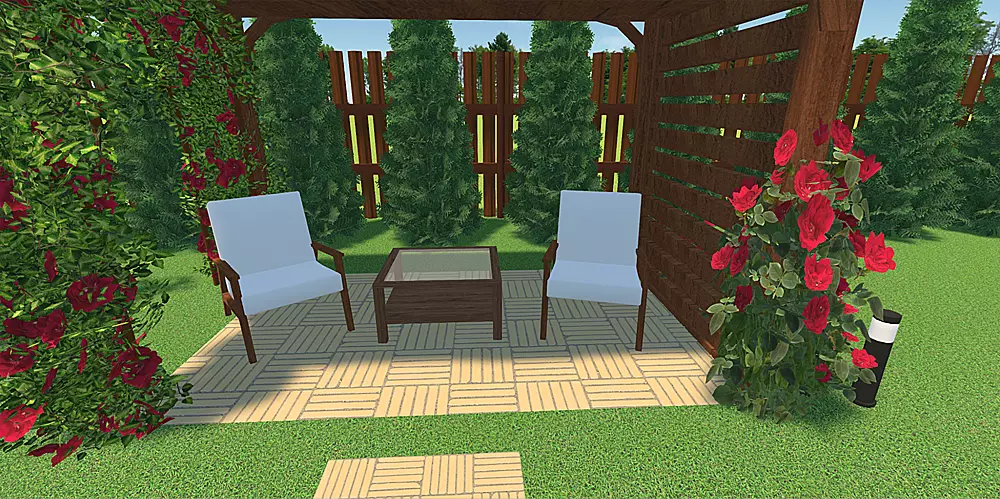 Готовый проект в 3D позволяет оценить соотношение размеров всех элементов, увидеть целостную картину будущего участка. С таким подробным планом вы можете не сомневаться, что правильно подберете место для оформления перголы.
