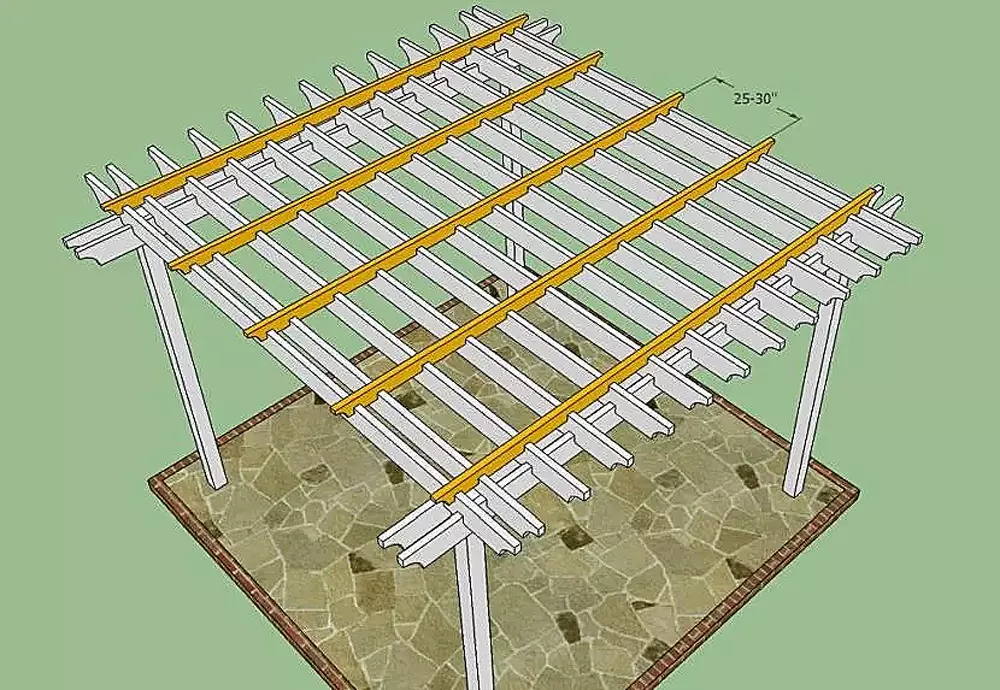 Шаг 5. Монтаж поперечных балок. Возьмите доски той же ширины и длины, что и для опор, оформите края лобзиком. Проделайте пазы в местах соединения с опорными балками, закрепите саморезами. Поперечные балки устанавливают с шагом около 30 см — чем плотнее, тем гуще будет тень.