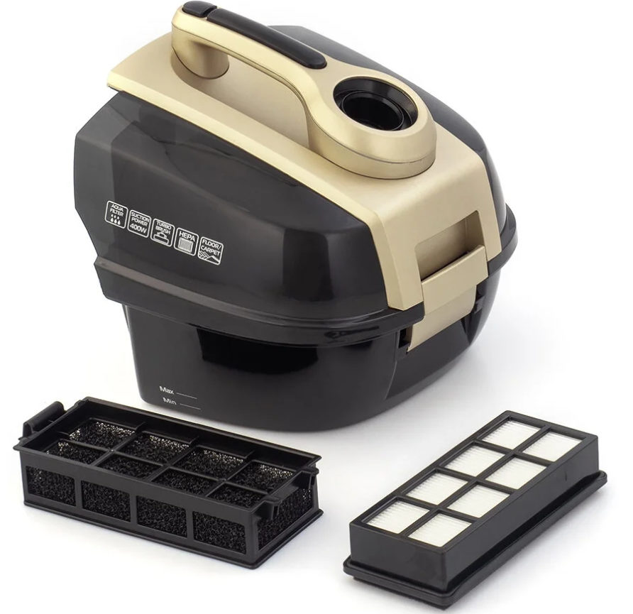 Пылесос для сухой чистки оснащен системой из аквафильтра и НЕРА. Обладает мощностью 350 Вт, объем резервуара составляет 1,2 л. В набор входит турбощетка для ковров, агрегат позволяет добавлять в воду при уборке ароматические жидкости.