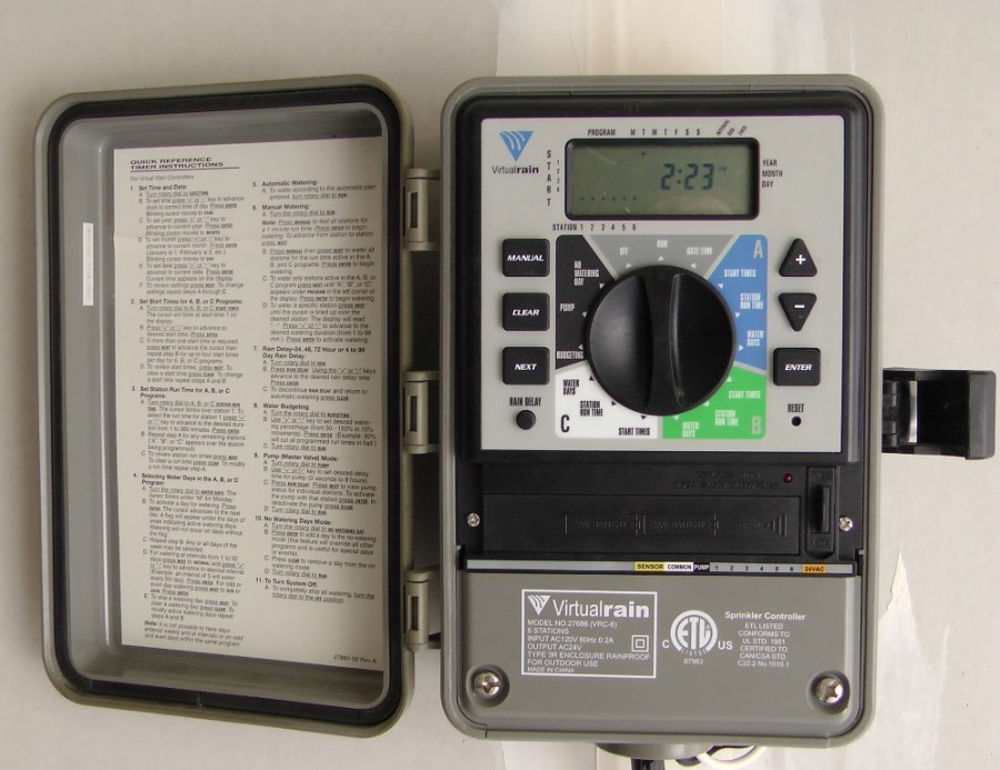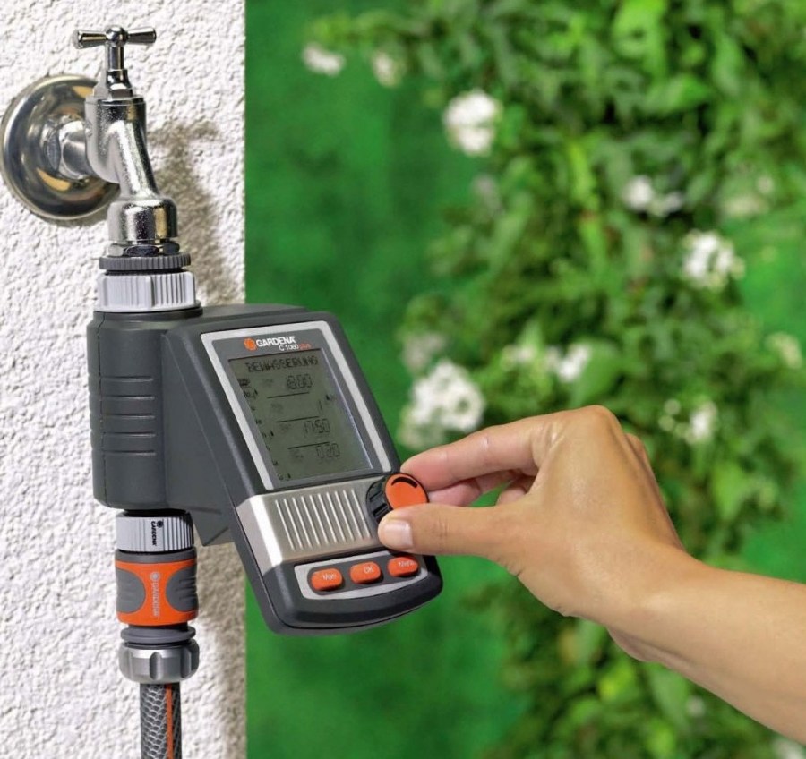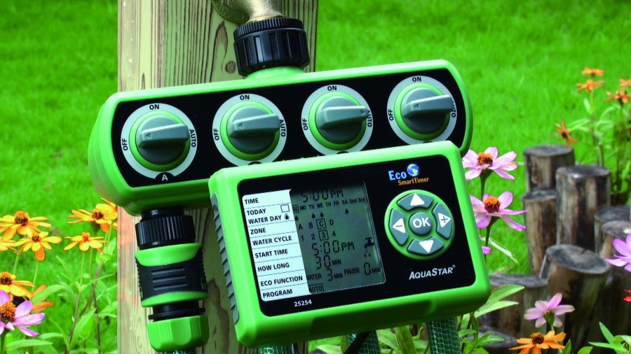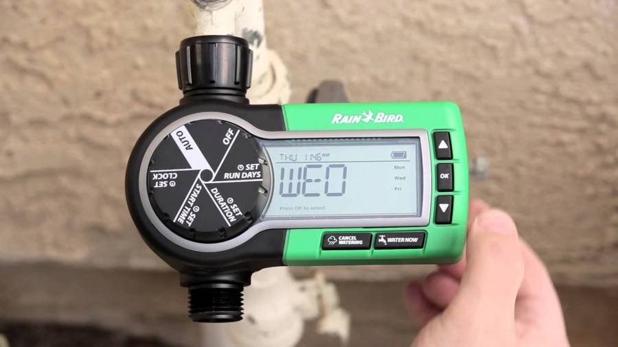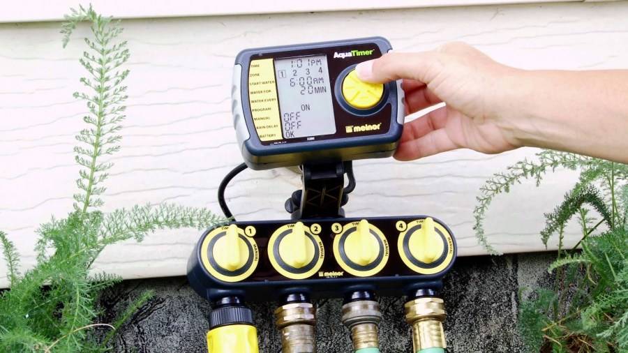 Для организации автополива понадобится шаровый таймер. Устройство позволяет запрограммировать продолжительность и периодичность работы орошения. Работает устройство от нескольких батареек типа АА (ААА), заряда которых вполне хватает на весь сезон. Некоторые производители производят таймеры со встроенным фильтром, электромагнитным клапаном. Последний вариант не годится для систем со слабым напором (клапан не откроется).