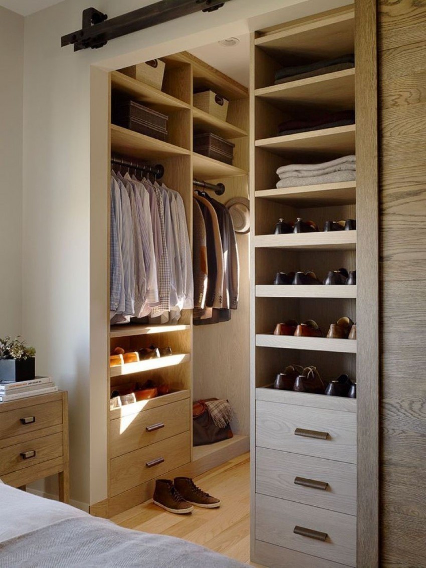Полноценная гардеробная комната из кладовки получится, если изнутри наполнить ее разнообразными отсеками для хранения. Для верхней одежды подойдет длинная горизонтальная перекладина, обувь сохранит первоначальную форму на специально отведенных для этого подставках. Ну, а шляпки лучше всего положить на верхние полки. Посередине отлично впишутся выдвижные ящики со всякой мелочью по уходу за одеждой и обувью.