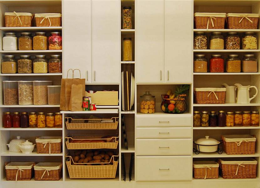 Кроме полок в кладовке стоит использовать крючки, корзины и ящики.