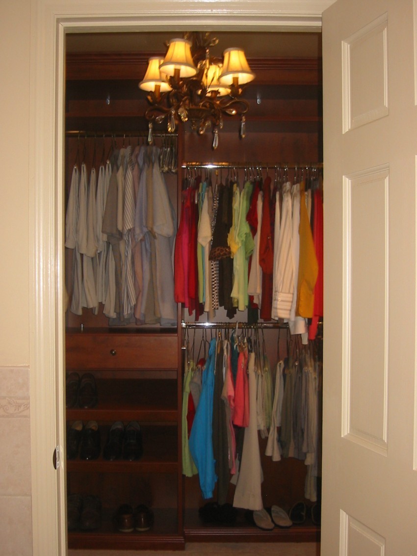 Если одна из стенок бывшей кладовки выходит в спальню, в гардеробной из кладовки наполнение подбирается по-другому. Большей частью тут будет находится весь сезонный гардероб — все, что носится в данный момент. Потому отделений требуется больше. Для платьев, костюмов, юбок и брюк нужны отделения с вешалками. При достаточной высоте потолка (2,5 — 2,7 м) можно расположить два отделения для хранения вещей на вешалках: один над другим. В нижней части можно установить обычную трубу, в верхней удобнее будет пантограф. Пантограф — это труба, оснащенная механизмом, который позволяет ее опускать и поднимать.