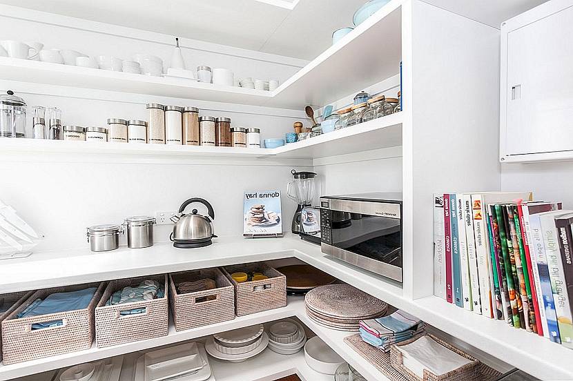 Высокие стеллажи до потолка позволят удвоить полезную площадь кладовки. Также как и встроенная конструкция, она не займет много места и сделает интерьер помещения более просторным и уютным. Кроме того, можно установить отдельные полки своими руками – это наименее затратный способ построить кладовку. Разместить их лучше от пола до потолка. Для этого вам понадобятся уголки и сами полки. Угловая или П-образная полка вместит в несколько раз больше вещей. А чтобы кладовка была более функциональна и вместительна, можно проработать конструкцию вращающегося углового блока.