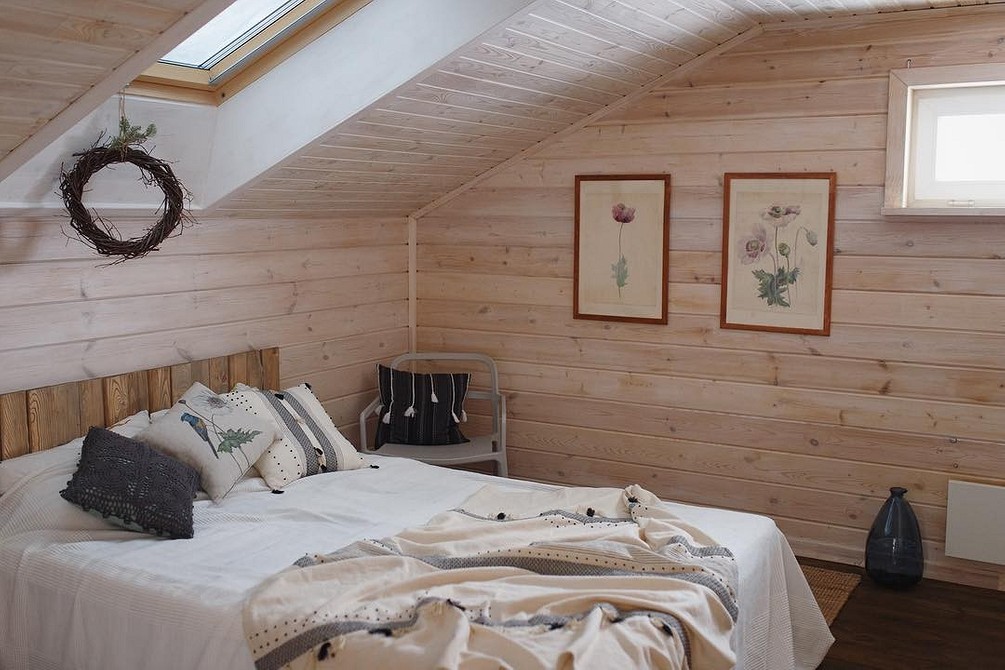 - Такую мансарду можно обшить вагонкой из дерева. Материал должен быть экологичным, от МДФ лучше отказаться.