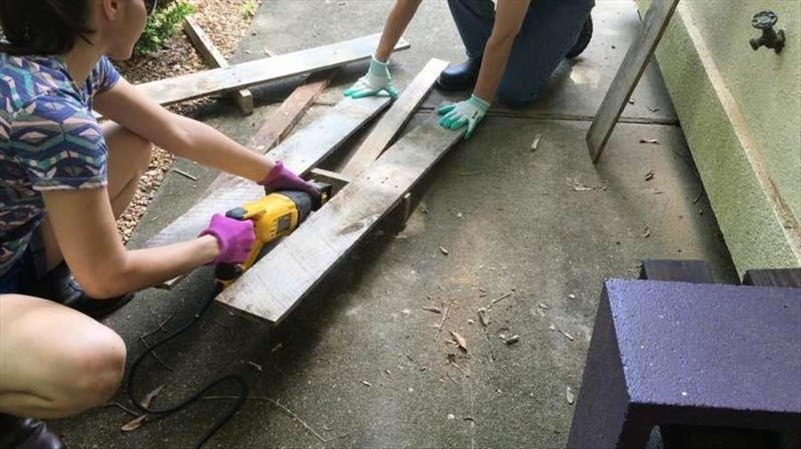 Первым делом рабираем старые поддоны на доски, обрабатываем их и можем покрыть лаком
