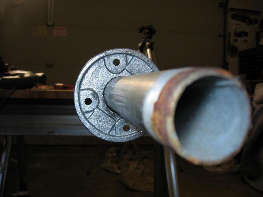 Устанавливаем первую ступень стеллажа. Крепим фланцем к полу и выводим горизонтальное колено