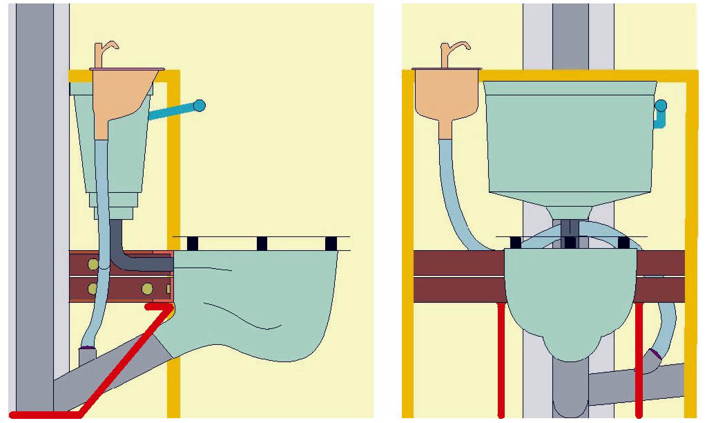 Следующий этап – обшивка проходящих через туалет стояков. Проверенный способ – монтаж каркаса из деревянных брусьев либо оцинкованных профилей с последующей облицовкой влагостойкими ГКЛ. Работы выполняются в таком порядке: